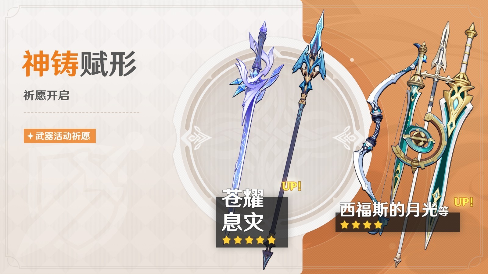 除此之外,「神铸赋形」活动祈愿也已开启,全新限定五星武器「单手剑·苍耀」、限定五星武器「长柄武器·息灾」迎来概率UP!