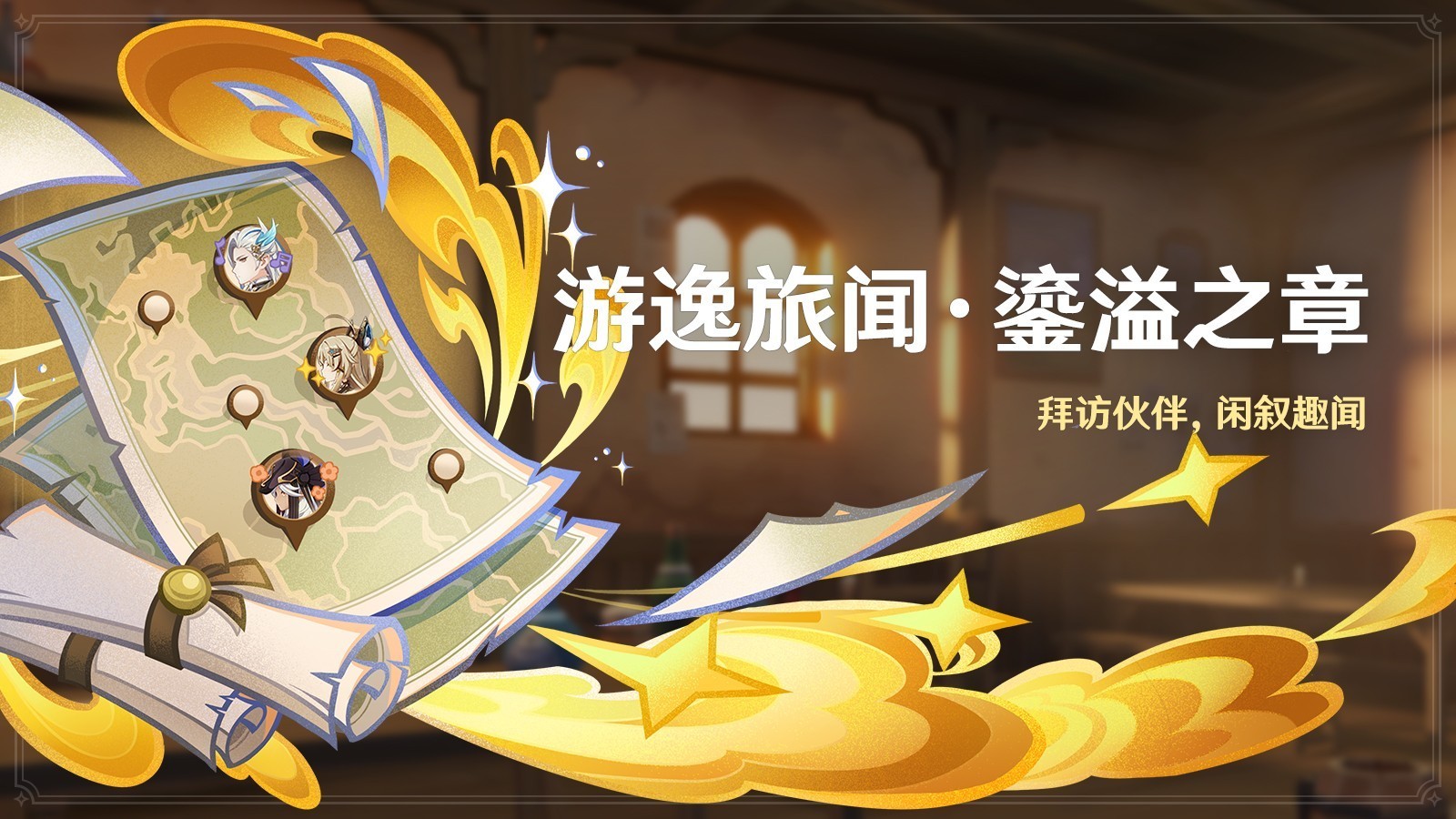 活动「游逸旅闻·鎏溢之章」将会开启,活动期间旅行者可以拜访伙伴,完成指定数目的逸闻后,即可获取原石、大英雄的经验等奖励。