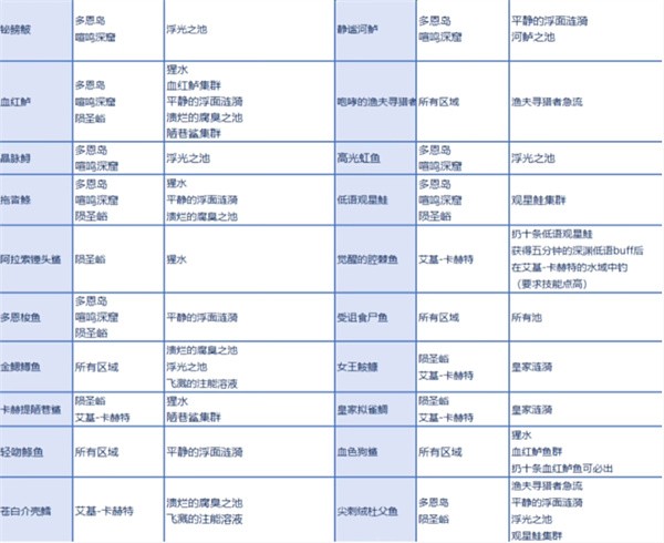 有几条特殊的鱼,比如血色狗鲨需要在腥水丢10条血红鲈才能钓到、觉醒的腔棘鱼需要在艾基卡赫特丢10之低语观星鲑才能钓,女王鮟鱇需要在皇家涟漪丢10只皇家拟雀鲷之后才能调。