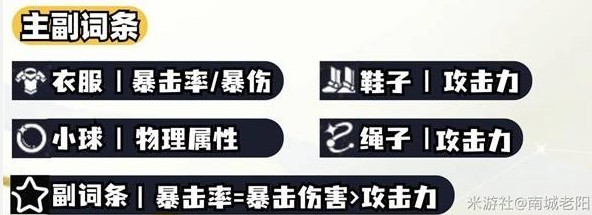 ①、主词条:暴击/暴伤衣、攻击鞋、物理球、攻击绳。