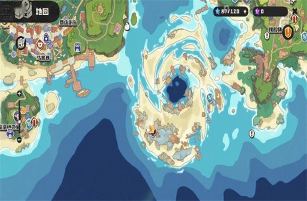 在地图上可看到带有漩涡的小湖旁停着一艘小船。
