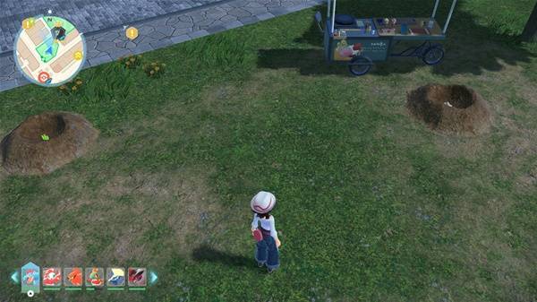 土坑的机制是当角色或宝可梦走到附近时,里面的宝会冲出地面,之后才能正常对战和捕捉。不过土坑中心会冒出宝的头部,这里可以看到左侧的坑是绿色的叶子,里面藏的就是哈力栗;右侧灰色的则是掘地兔。另外如果是头目,冒出的头部会比一般的宝更巨大。