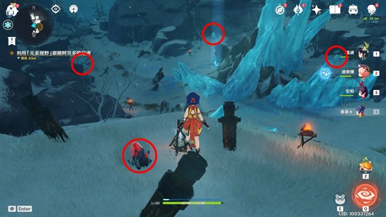 2、一个在坚冰高处,另一个在雪堆中(随机),用火元素攻击融化雪堆即可。