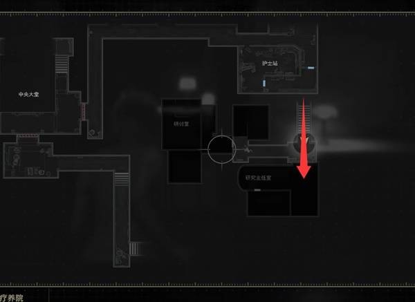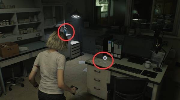从等候室东面的楼梯上楼,拿到墙上的东侧地图,然后进入研究主任室有撬锁工具和存档点。