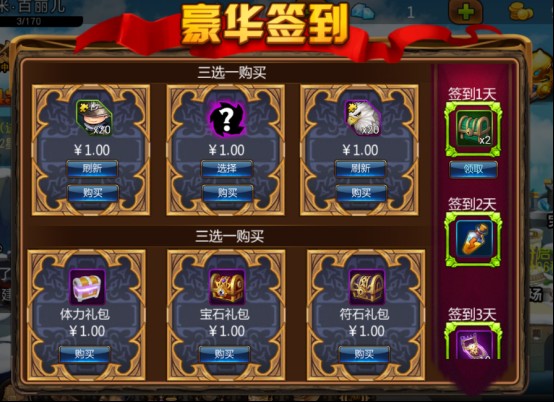 每日登录都可以免费领取不同的奖励,玩家还可以花费1元购买三选一的道具