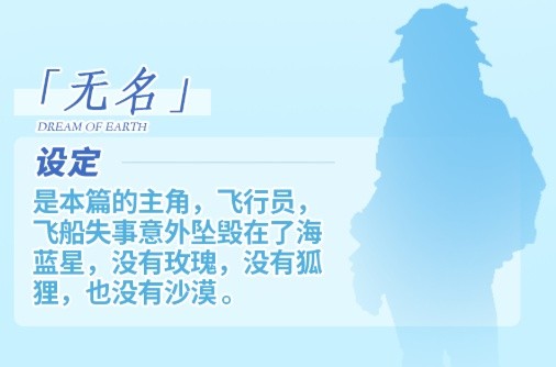 是本篇的主角,飞行员,飞船失事意外坠毁在了海蓝星,没有玫瑰,没有狐狸,也没有沙漠