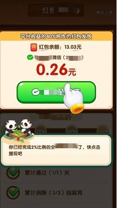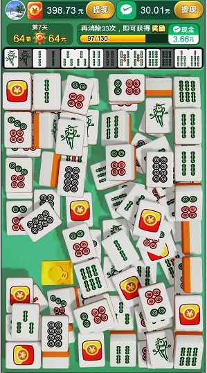 闯关领红包,界面中的所有麻将全部消除后就可以通关了,这里还有晋升等级的系统玩法。
