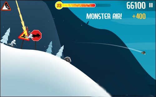 此外你还可以借助下坠来增加速度,当你保持高斜度下坠姿势一段时间后就会喷出黄色火焰,为你增加一级速度,假如你还能继续保持这个姿势一段时间,甚至可以喷出红色火焰,再次为你增加速度,最高可以出现蓝色火焰,三倍加速。在喷火焰的短暂时间里,你可以抵消一次石头带来的冲击,但是无法抵消垂直摔入雪堆里的冲击。