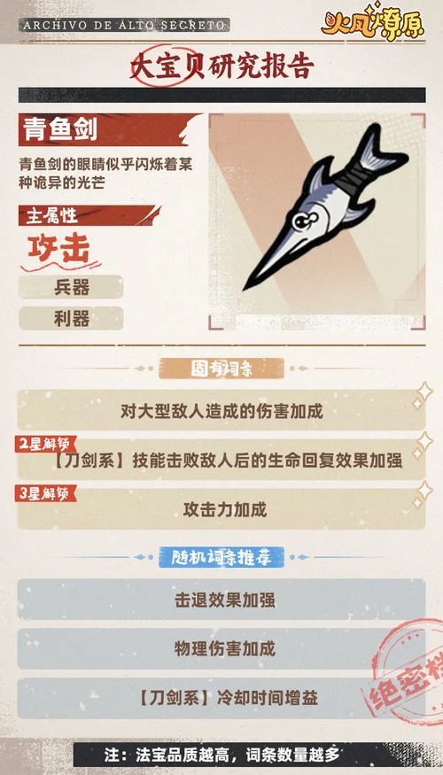刀剑系法宝,适用于张辽,孟坦这样的刀剑型武将,推荐词条和偃月刀没有太大的区别,获得了即可使用哦。