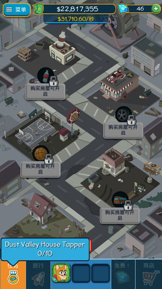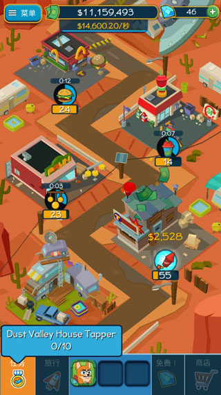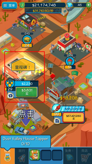 在你获得一定数额的金币之后,就可以用它们来继续升级已有的商业区或者购买新的商业区。把商业区升至一定的等级之后,你就可以填满里程碑来加快生产金币的速度。每购买一个里程碑,速度都会加快一些,升级到一定程度之后,就可以达到不间断产生金币,你就坐等钱儿乖乖进入你的口袋吧!