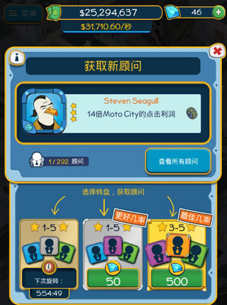 拿到的钻石我们可以干些什么呢?一是可以进行抽奖,抽取各种adviser顾问卡牌,为你赚钱提供帮助,每个人是可以有三个顾问的哦;