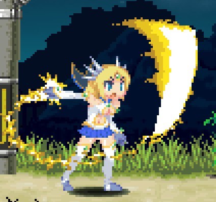 空中攻击转刀,米莉亚空战的精髓,范围超大,一次转刀可打出2次判定,配合米莉亚空中可跳6次每跳一下一个转刀简直酸爽,也可以一边跳一边大范围的移动防止被怪围