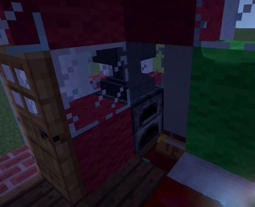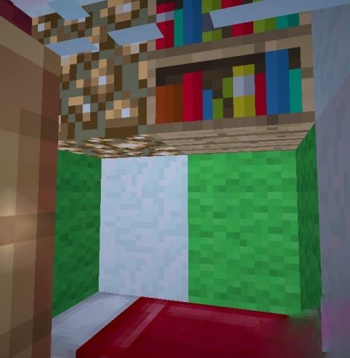 1、准备工作:准备好绿色羊毛、 红色羊毛、雪块、树叶、玻璃、云杉木板、 萤石、 书架、 工作台、 铁砧、 熔炉、 箱子。