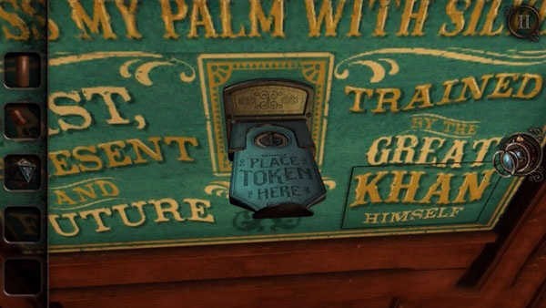 接下来的目标就更明确了,当再次进入房间后,马上来到塔罗牌游戏机前,到处都戳戳,看有啥地方可以动的。然后,你会发现塔罗牌游戏机中间有个 PLACE TOKEM HERE 的入口,把它拉出来,就可以得到第一个小机械装置。