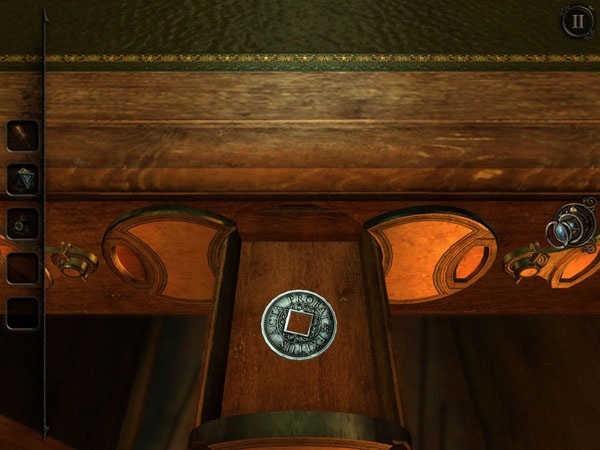 4、等两旁的枷锁都释放后,中间的暗格就会自动挪出来,得到第一枚硬币。