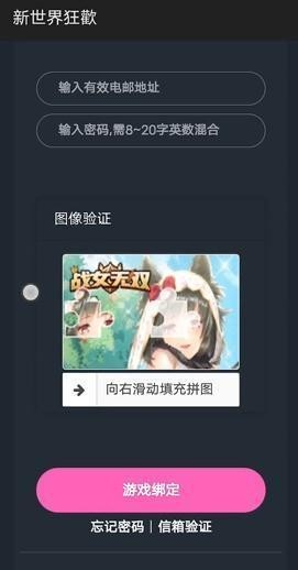 5、接着需要输入邮箱地址和密码,完成图片验证之后点击游戏绑定;