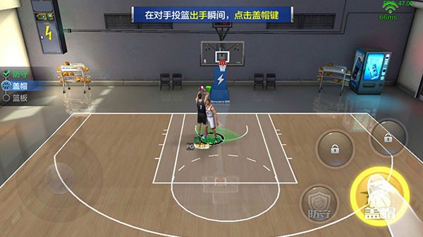 盖帽:敌人在面前投篮时可点击盖帽按键,在敌人面前扇形区域内起跳盖帽成功率较高