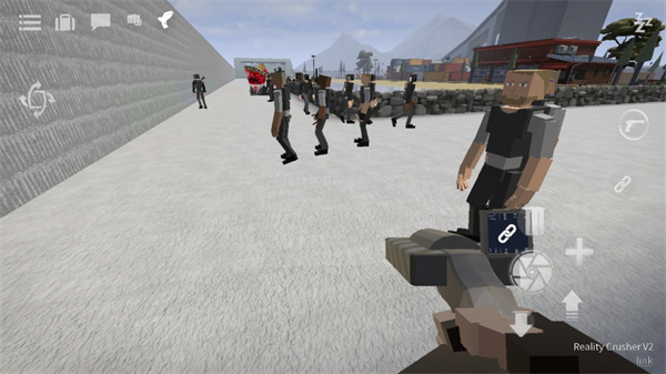 4、点击右边“手枪”按钮拿枪,可以让角色切换到持枪状态,中心用于开枪,+号可以新增靶子角色。