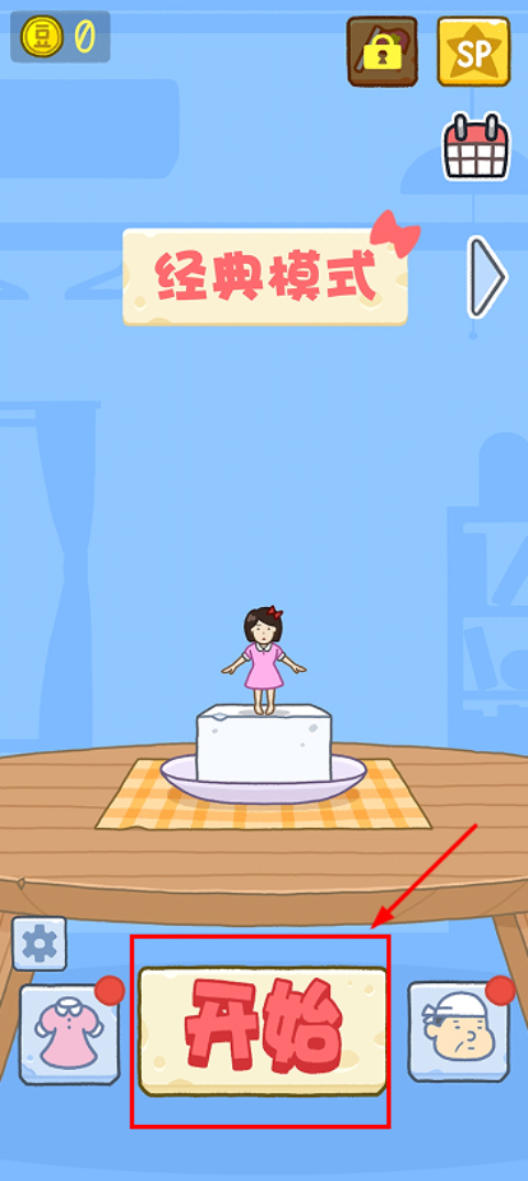 2、这里以经典模式为例,点击开始,进入游戏如图,玩家需操纵豆腐女孩进行跳跃来堆叠豆腐;