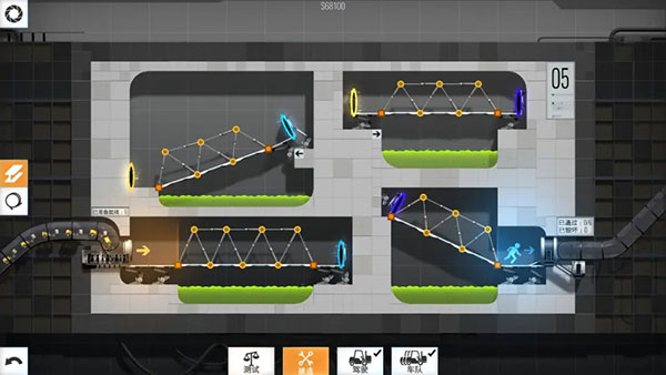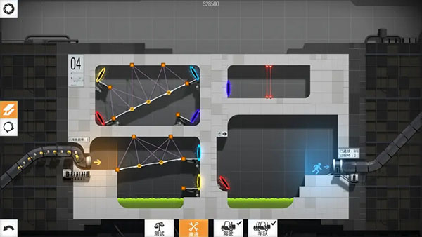 上色。这一关增加了不同颜色的传送门,相同颜色的传送门进出。铺设桥面,连接两个点,进行硬化,使用三角形结构加固,即可通关。