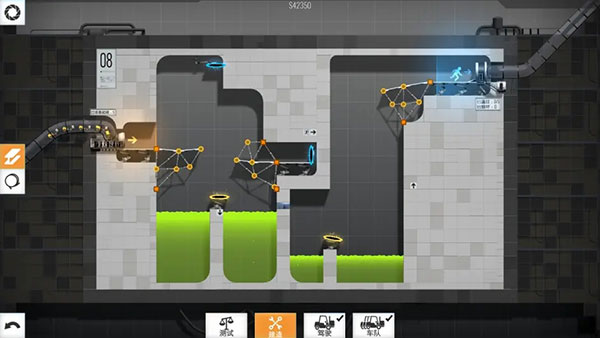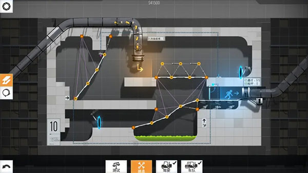 斜坡。这一关用到了三角形稳定结构,先铺设上一层桥面,然后点击桥面进行硬化,在桥面的下方,搭设三角形结构进行支撑,即可通关。