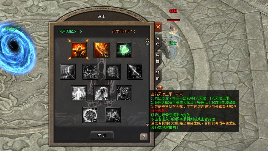 点击角色界面右侧[天赋]页签打开,等级达到45级后每升1级获得1天赋点,使用天赋石(橙色以上BOSS几率掉落)也可获得天赋点,消耗天赋点学习不同的天赋,天赋与职业合理搭配可实现最佳效果。若想更换所学天赋,可在药店内赛华佗NPC处重置天赋点。