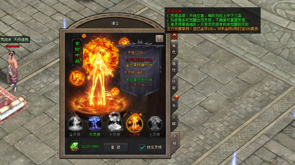 点击角色界面右侧[灵根]页签打开,等级达到55级后免费觉醒五行灵根,可获得对应的五行属性加成,最高可觉醒双灵根。灵根品质分为天、地、玄、黄4阶,每阶分上、中、下3品。若对当前灵根不满意,可消耗绿色晶石(分解绿色/紫色装备获取)重塑灵根。灵根与配饰、时装等装备的基础五行搭配即可。