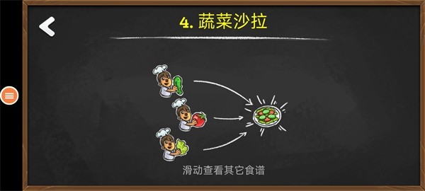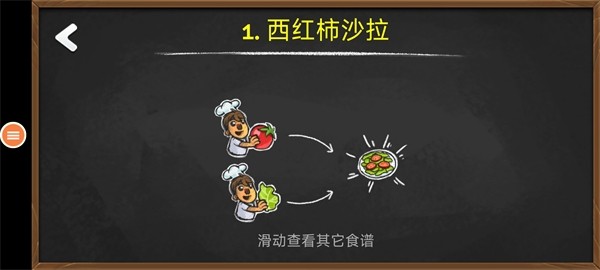 游戏开始后,你会看到左上角显示的订单要求,根据订单的提示,选择相应的食材开始制作,比如,我们首先点击【蔬菜】取出沙拉,取出沙拉后,接下来点击【西红柿】,将西红柿加入沙拉中。