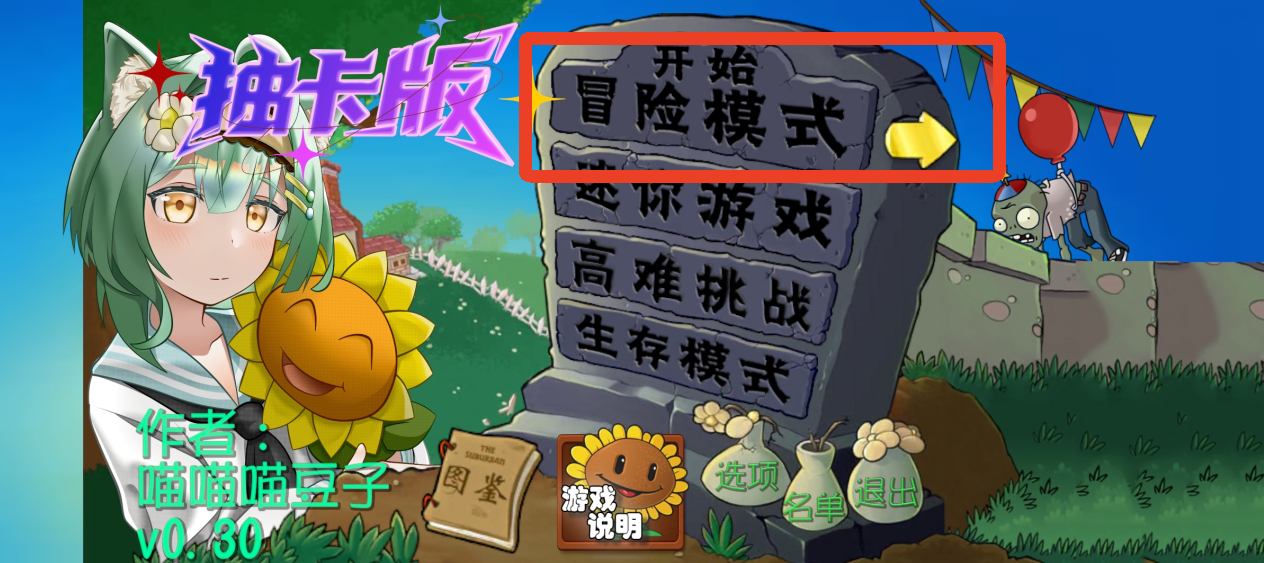 1、这款游戏中,新植物需要通过关卡抽卡获得,首先我们点击墓碑第一个【冒险模式】。