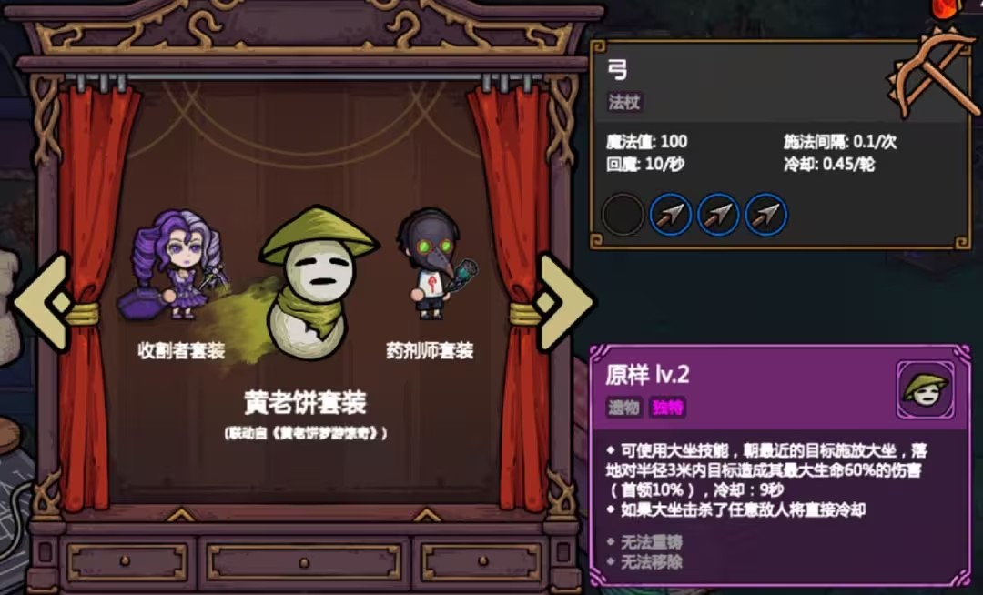 自带【弓】和3个【黄老饼的箭头】,解锁6个不同套装后自动解锁,升级可以增加【大坐】伤害范围并减少冷却。黄老饼套装自带位移效果使他可以轻松脱离怪物的包围,或者前往位置独特的箱子旁边。【大坐】的百分比伤害对高血量地方,特别是隐藏BOSS效果惊人,击败敌人后重置冷却的被动也让黄老饼随时可以上下翻飞,很适合对于游戏有一定了解的玩家。