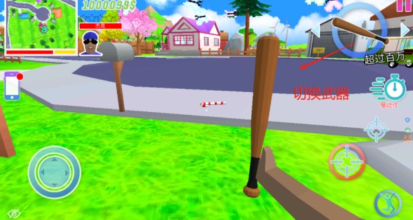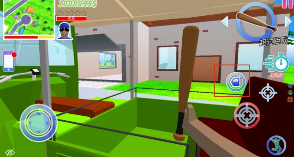 2、我们可以点击右上角这个圆圆的按钮切换我们的武器和工具,比如你可以选择枪或者是棒球棍。