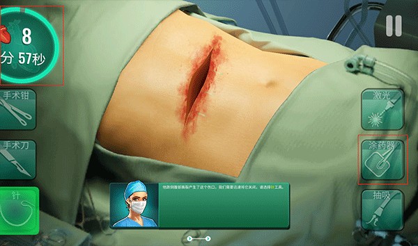6、手术是有时间限制的,在左上角的显示的时间内完成得分会更高。如果时间到了还没完成则手术失败。