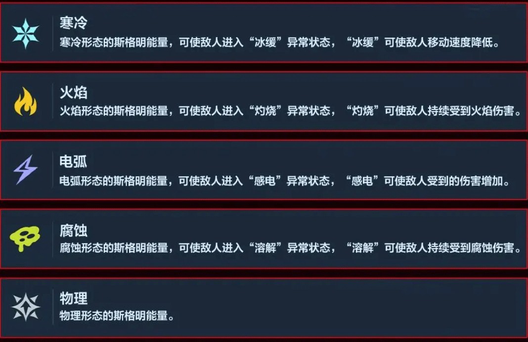 火焰:可使敌人进入 “灼烧” 异常状态,“灼烧” 可使敌人持续受到火焰伤害。
