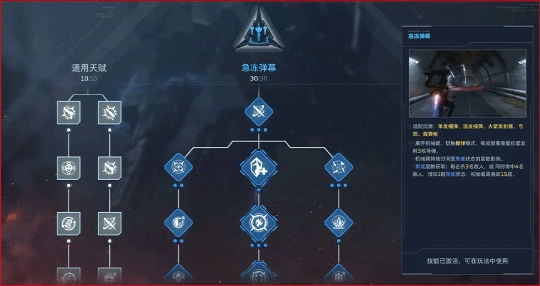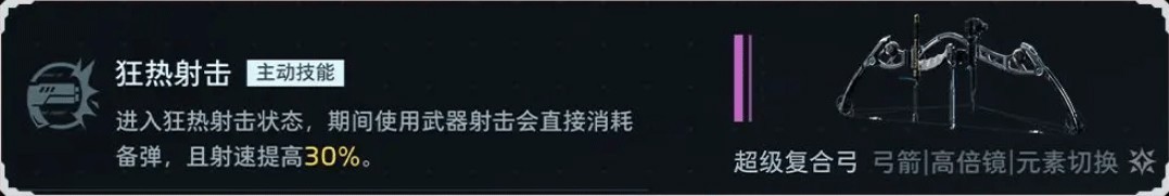 副武器(超级复合弓)技能:狂热射击(主动)→ 进入狂热射击状态,期间使用武器射击会直接消耗备弹,且射速提高 30%。