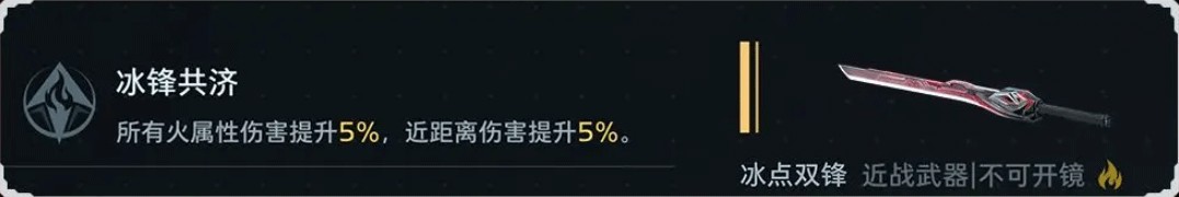 近战武器(冰点双锋)被动:冰锋共济 → 所有火属性伤害提升 5%,近距离伤害提升 5%。