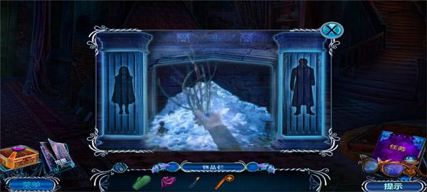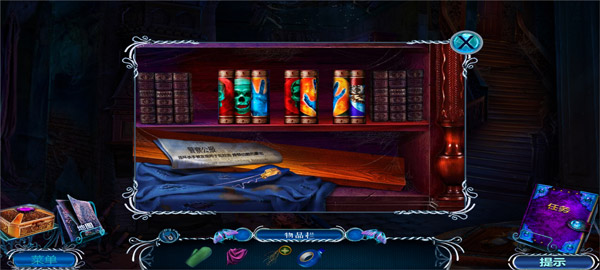 11、拿走书柜上的开锁器和木板,拿走右边圆桌上的特殊眼镜,可以查看蓝色迷雾;