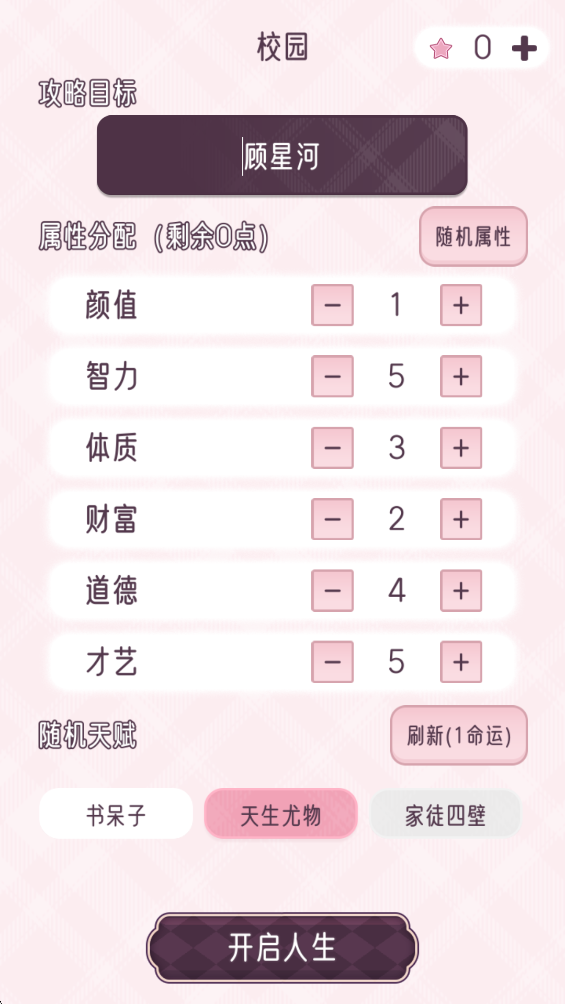 3、开始分配你的属性点数,以及随机天赋。你也能给攻略目标换个名字,所有都准备好后就能开启人生了!