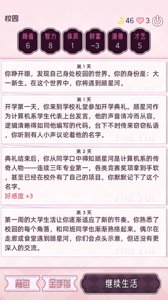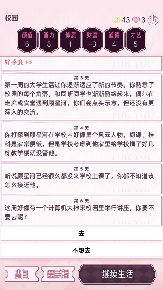 5、点击继续生活能推进剧情,和看小说一样。