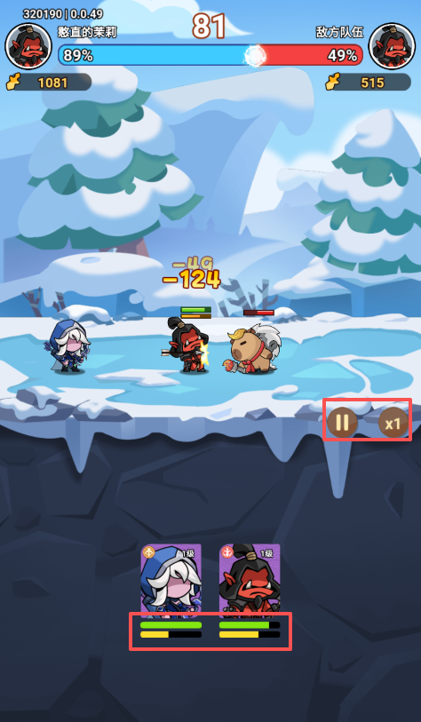 3、屏幕下方可以看到每个英雄的血量和怒气条,英雄攻击或者受到攻击都会增加怒气,满值则会释放技能,玩家还可以设置自动战斗或者调节倍速战斗。