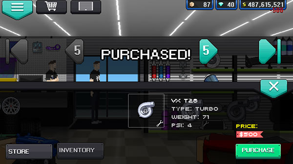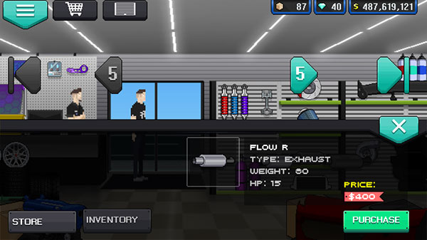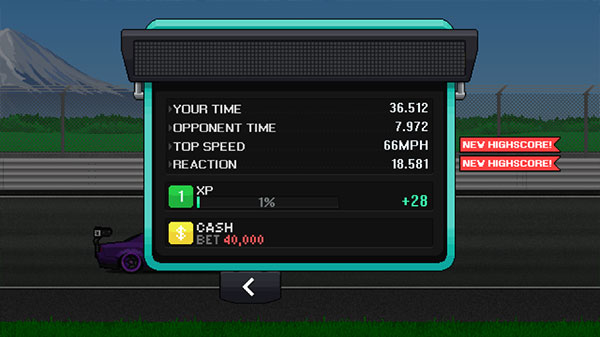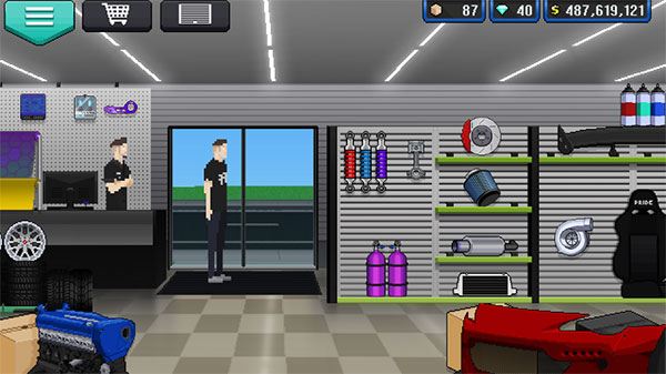 1、在像素赛车手最新版游戏中,首先是全局的变化,现在进去车库或者商店等都会有一个类似翻页的过场动画,其次是游戏的帧数更高了,玩起来比以前更流畅