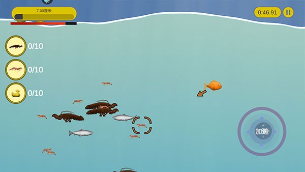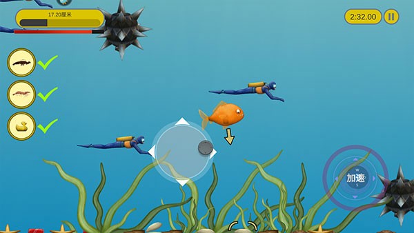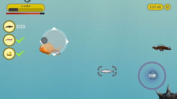 2、游戏中的控制采用虚拟摇杆操作方式,左边为控制小鱼的移动,游遍为耐力加速,点击即可获得加速效果。
