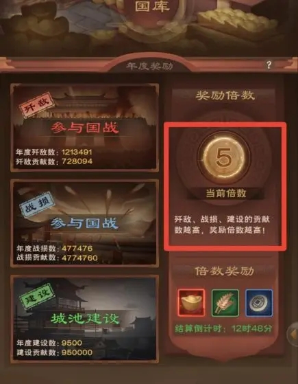 我们的国库是通过战斗歼敌,战斗战损以及建设城池的贡献来计算,得出相应倍数来分配的。所以大家需要积极参与国战和城池建设来提高自己的奖励倍数。(特别提醒:国库奖励是需要自己在春季进入国库手动领取的,大家千万不要忘记领取哦)