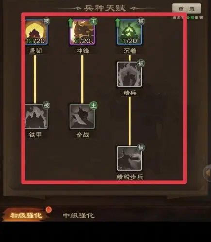 总结:兵种天赋可激活兵种的主动和被动技能,首选激活主动技能,次选被动技能。之后优先将首技能提升到5级,开启可学习后置技能,激活后置技能后,优先提升前置主动技能。