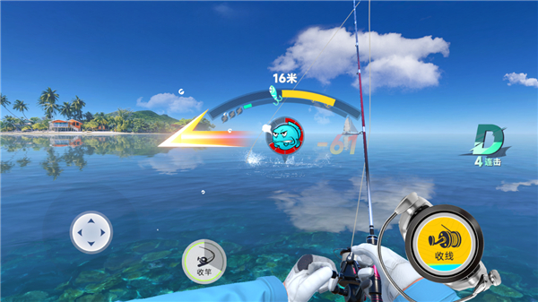 6、中鱼后根据鱼的反方向移动左下角的方向键,同时按收线在黄色的区域中,不要超过否则容易断线;
