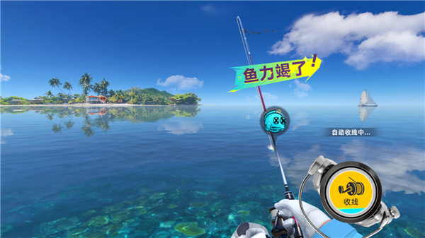 7、通过不断以上操作消耗鱼的力气,最终鱼没力即可自动收线;