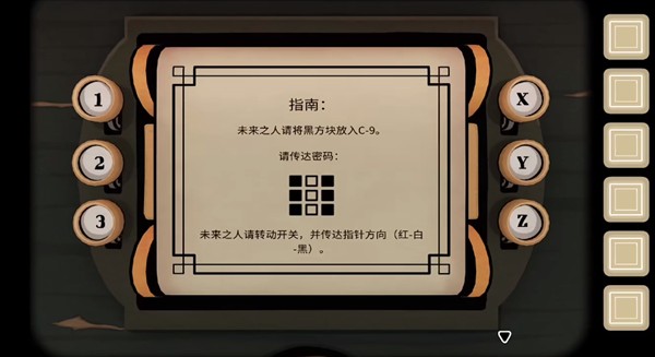 【未来】视角:从方块装置取得【黑方块】,将黑方块放入C-9凹槽,根据线索点击九宫格;