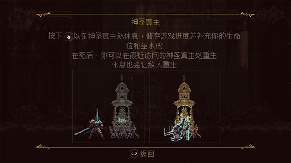 6、跟随指引往前走,玩家可以遇到第一个“篝火”,游戏玩法类似魂游,有血瓶、坐火等设定,在这里你可以恢复自己的状态以及血瓶数量,但是小型敌人也会复活。