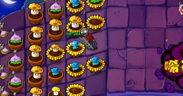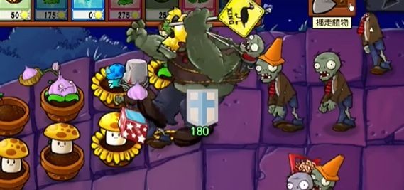 4、后期可将第一列的阳光菇替换成毒大蒜投手,之后使用爆炸樱桃就能解决图中大型僵尸。