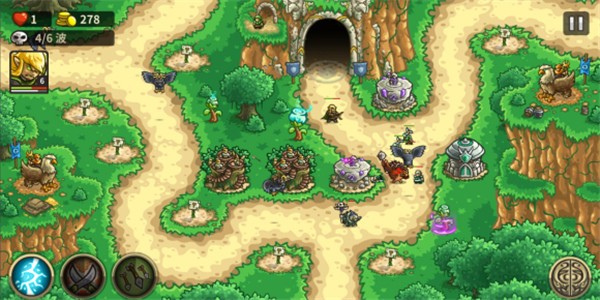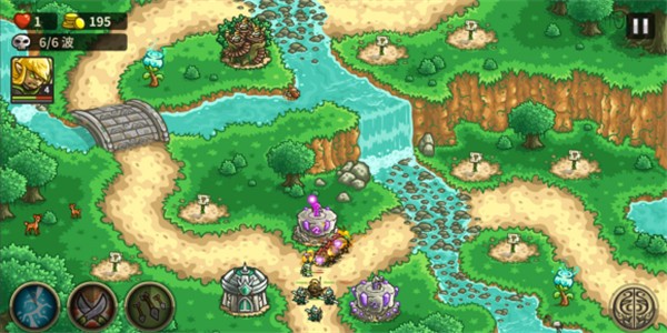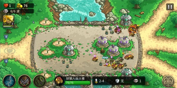 第五波怪物不要提前征召,不然打不过,箭跟雷好了就放,在第五波怪物到来之前建立上方的法塔和下方的兵营,优先把两个兵营升到三级。