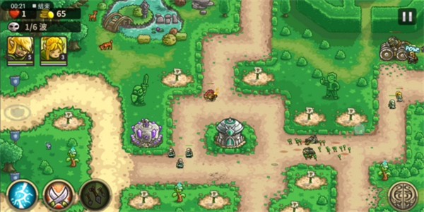 左下图标依次为作战、英雄挑战、铁人挑战,难度依次增加。作战模式可使用所有技能升级以及英雄,最多获得3星进行升级。英雄挑战需要完成3星作战解锁,只有6波敌人,不能放过一个,不同关卡有不同的技能等级要求(如只能使用第一等级技能),前几关限制英雄使用。铁人挑战需要完成3星作战解锁,只有1波敌人,不能放过一个,只能使用指定类型防御塔,不同关卡有不同的技能等级要求,前几关限制英雄使用。